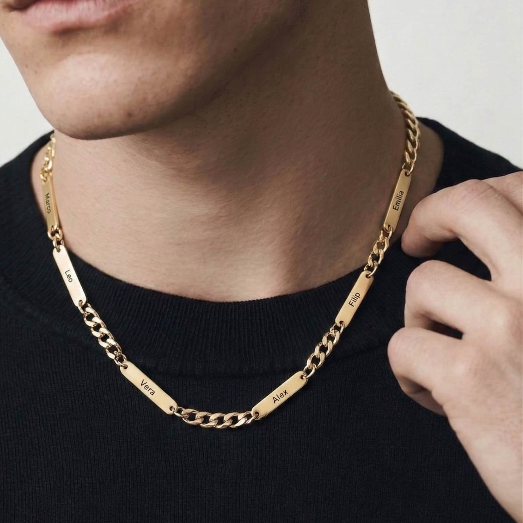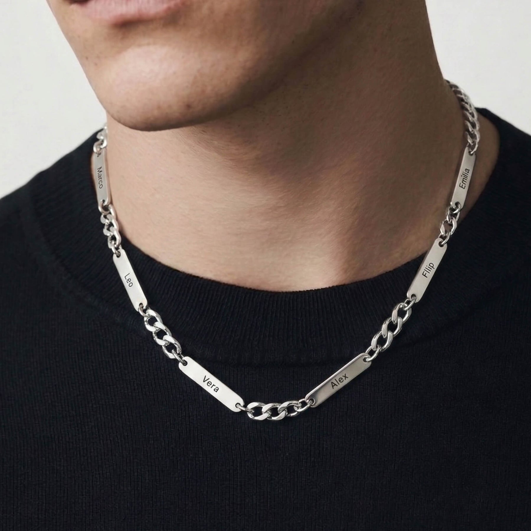 Each bar can be engraved with a name, date, or word — a subtle way to keep what matters most always close. Made for daily wear, the Personalized Name Link Necklace blends bold design with sentimental value.